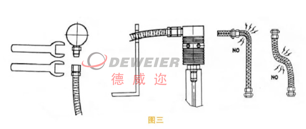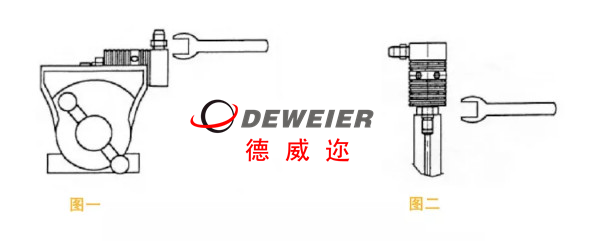 使用兩支開口扳手,一支固定管接頭,一支鎖高壓管,避免使旋轉(zhuǎn)接頭承受影響力而造成損壞,另高壓管應(yīng)以支架導(dǎo)正,支架不可靠近旋轉(zhuǎn)接頭以免旋轉(zhuǎn)接頭上下時受力,避免使旋轉(zhuǎn)接頭承受影響力或彎曲力(高壓水會使管子變硬),以確保旋轉(zhuǎn)接頭之壽命如圖三。